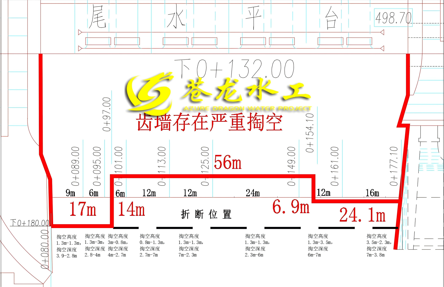 本项目主要包含2处水下修复区域,第一处为尾水护坦末端折断垮塌和齿墙基础掏空长约100m。第二处为尾水护坦下游冲刷坑,冲刷坑规模约为60m*17m*12.9m(长*宽*深)。